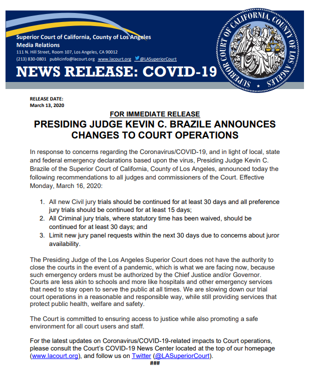 La Superior Court Delays Trials Non Essential Matters For Another