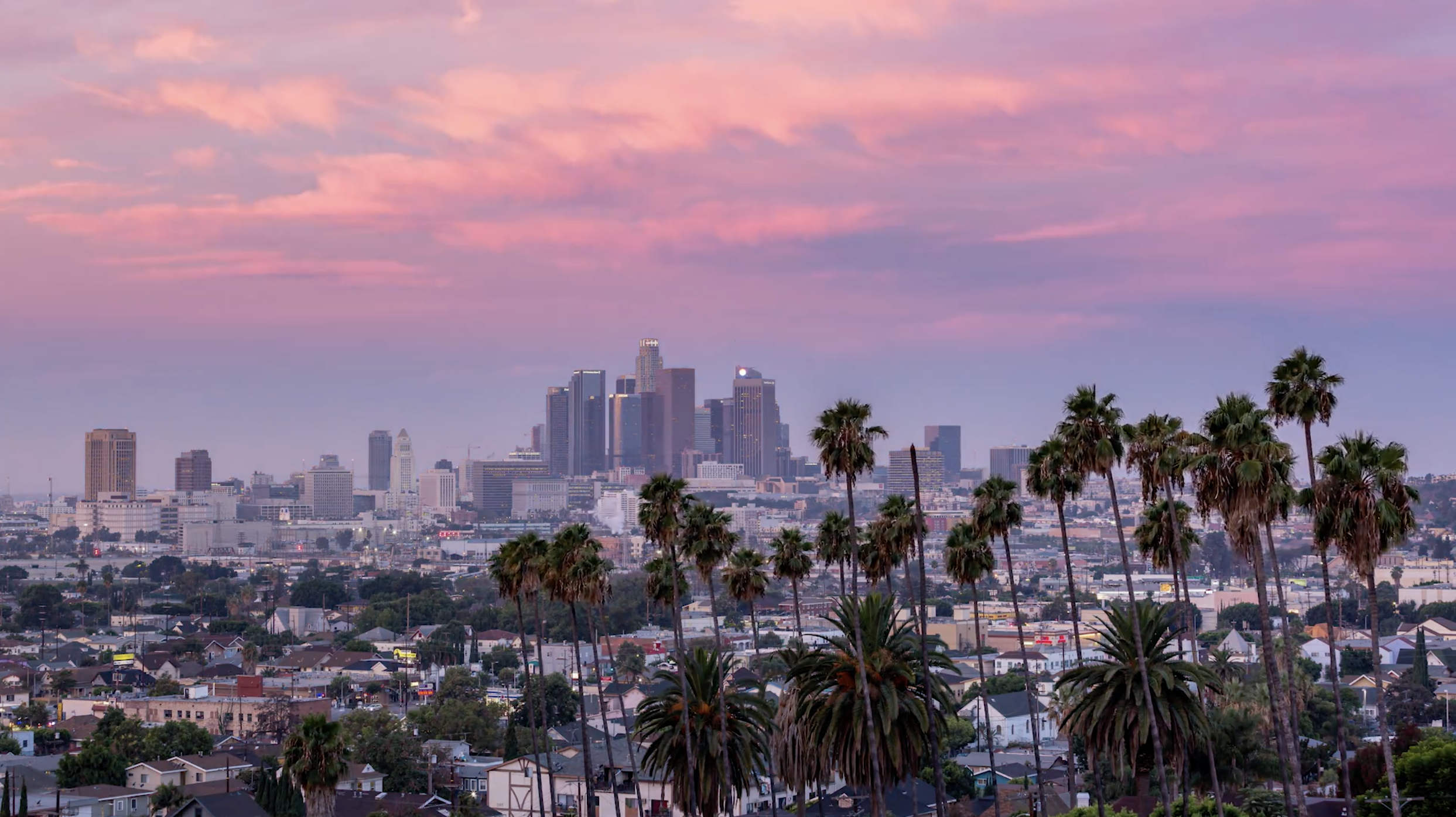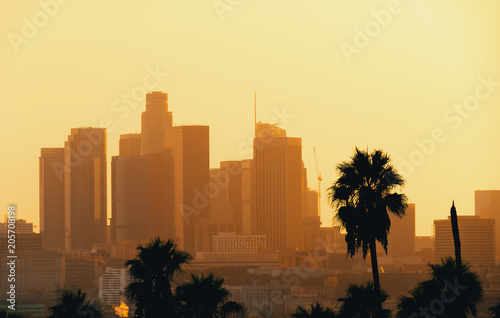 Beautiful Sunset Of Los Angeles Downtown Skyline And Palm Trees In