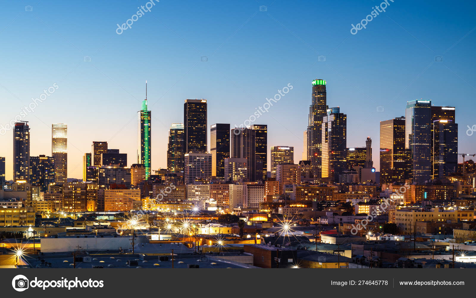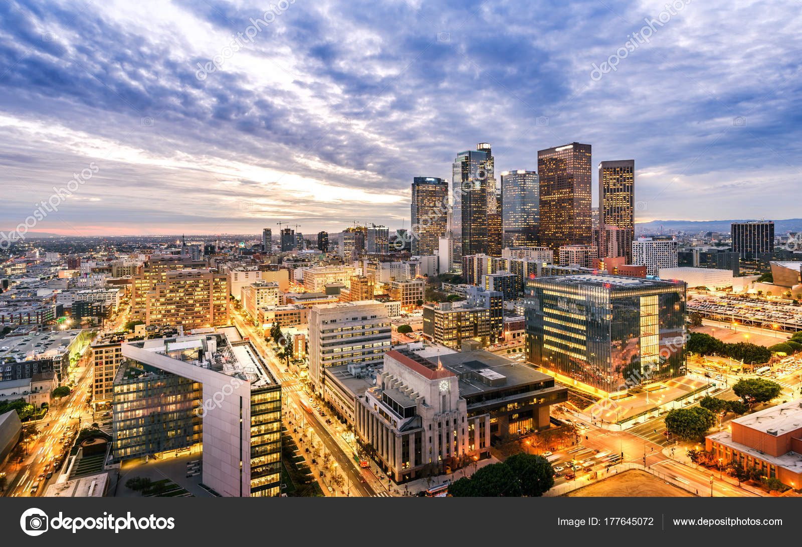 Downtown Los Angeles Skyline At Sunset High Res Stock Photo