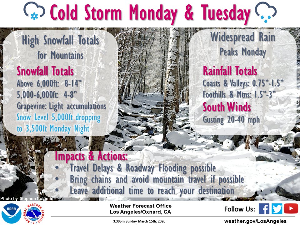 Nws Los Angeles On Twitter A Cold Storm Off The North Coast Of Ca Will Push South Bringing Heavy Snow To The Mtns And Widespread Rain For Mon Tues Light Snow Accumulations Are